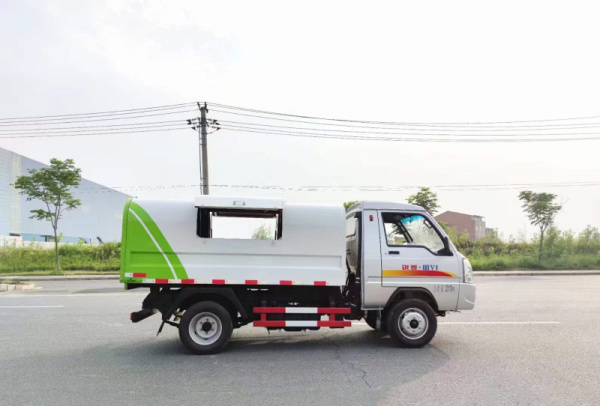 垃圾箱有效容積4個(gè)立方,全封閉式一體化結(jié)構(gòu)。兩側(cè)開一個(gè)或兩個(gè)垃圾投放窗口。投放窗口可用氣動(dòng)支撐和滑道支桿支撐,方便投遞垃圾。尾門密封(帶密封墊,密封緊密),可手動(dòng)開啟,開啟尾門可自卸垃圾。自卸式垃圾車工作原理跟自卸式貨車的一樣,就是箱體可以自卸,如同翻斗車、自卸車。裝垃圾的時(shí)候需要人用工具將垃圾弄上去,卸垃圾就是車輛液壓頂升起后將垃圾從箱體后部直接給倒出來即可。
