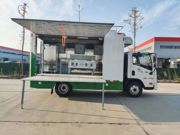 箱體外冷板,內不銹鋼板,5cm復合保溫板,底板防滑花紋鋁板,腳踏板,照明燈、抽煙機、廂體帶不銹鋼凈水箱、洗手池、污水箱、燃料箱、不銹鋼爬梯護欄,不銹鋼雙眼灶、平冷柜、蒸飯車、不銹鋼菜架等。