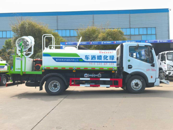 上裝配置:罐體容積5方,前沖(噴)后灑、帶側噴、帶后工作平臺、平臺上安裝綠化灑水高壓炮(炮噴射形狀可調:直沖狀、大雨、中雨、毛毛雨,可連續調節,最大射程可達30 米),配備大功率專用灑水泵,帶消防接頭,帶自流閥,帶自吸功能,帶濾網。(前置加裝電動灑水炮,后置加裝霧炮)